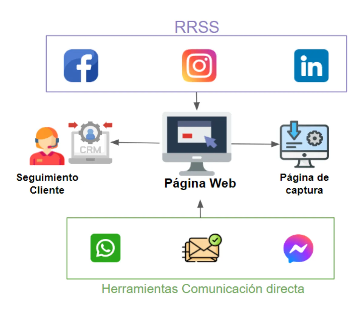 Las personas cuando están en alguna red social pueden ver tu publicidad y con un enlace ingresar a tu página web. Una vez aquí puedes usar páginas de captura para conseguir clientes potenciales y hacer seguimiento al cliente.